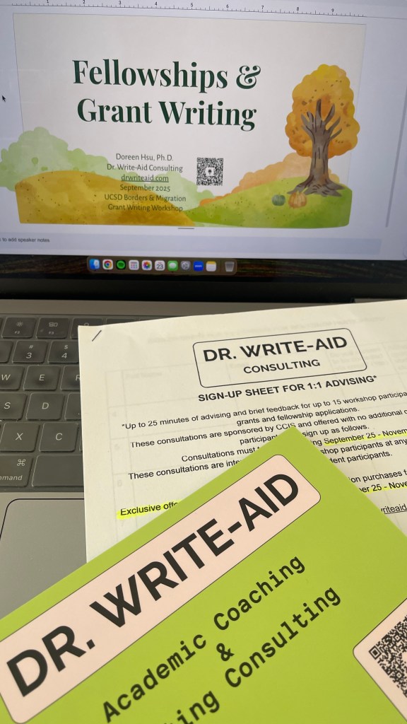 Onto the workshop events: on the first day, I presented a graduate student-focused workshop on writing fellowships and grant applications, and I was really pleasantly surprised that so many people showed up! The event was held via Zoom and in-person, so I thought everyone would attend virtually. But most participants came in person, which I think also goes to show the power of catering. When I used to give this fellowship and grant writing workshop, I would always use the example of the Ford Foundation Fellowship, but since it’s gone now (RIP), I used the example of the Mellon/ACLS Dissertation Innovation Fellowship.